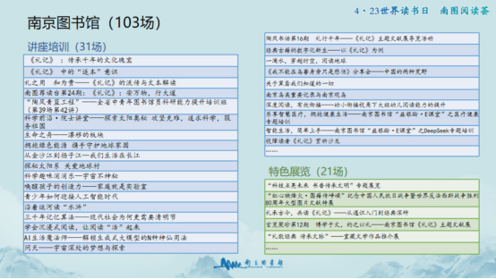 在南京的读书日活动中,中国女排全能战将张常宁带来“新时代女排精神分享会”,通过自己的亲身经历为大家展现了中国女排的风采;中国天体物理学家方成院士分享太阳奥秘,并且讲述自己攻坚克难的人生历程;“嘉惠讲堂”以中华传统文化百部经典——“《礼记》:安万物,行大道”为主题,开展多场主题讲座……40多场讲座与读书分享会,从人文到自然,从历史到科学,将在南京图书馆为读者开启独特的文化之旅。